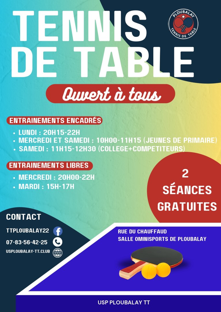 L'US Ploubalay TT est un club affilié à la FFTT et ouvert à tous. Enfants, adultes, débutants et confirmés sont les bienvenus. Nous proposons plusieurs séances réparties dans la semaine :